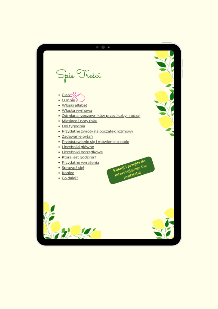 Wolisz uczyć się samodzielnie? Sprawdź mojego Italbooka na start z włoskim! Znajdziesz w nim wszystko co niezbędne, aby zbudować porządne fundamenty, które będą wstępem do dalszej nauki włoskiego! Podrzucam Ci spis treści Italbooka i jego przykładowe strony oraz link do strony sprzedażowej, na której znajdziesz więcej szczegółów.